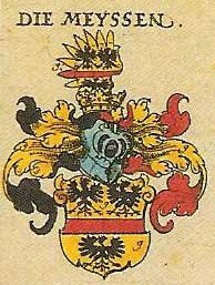 Or, a fess gules between three eagles sable, die Meyssen (198).